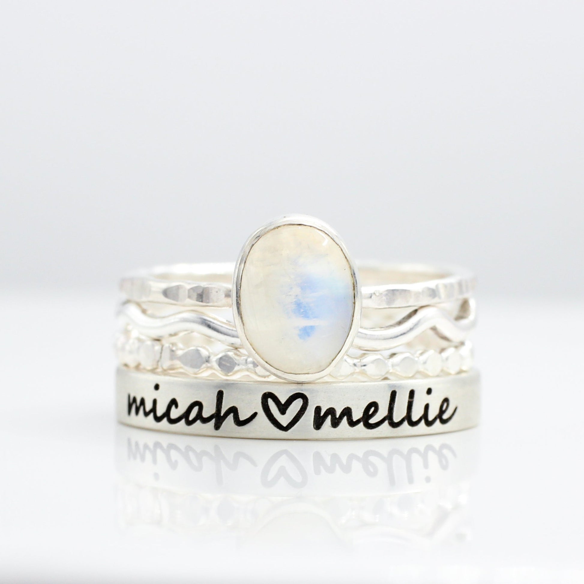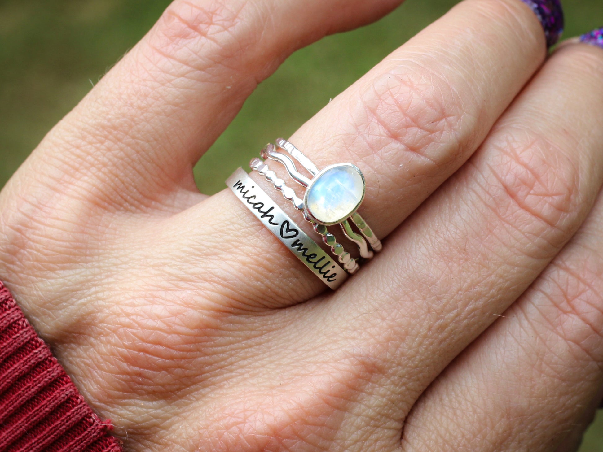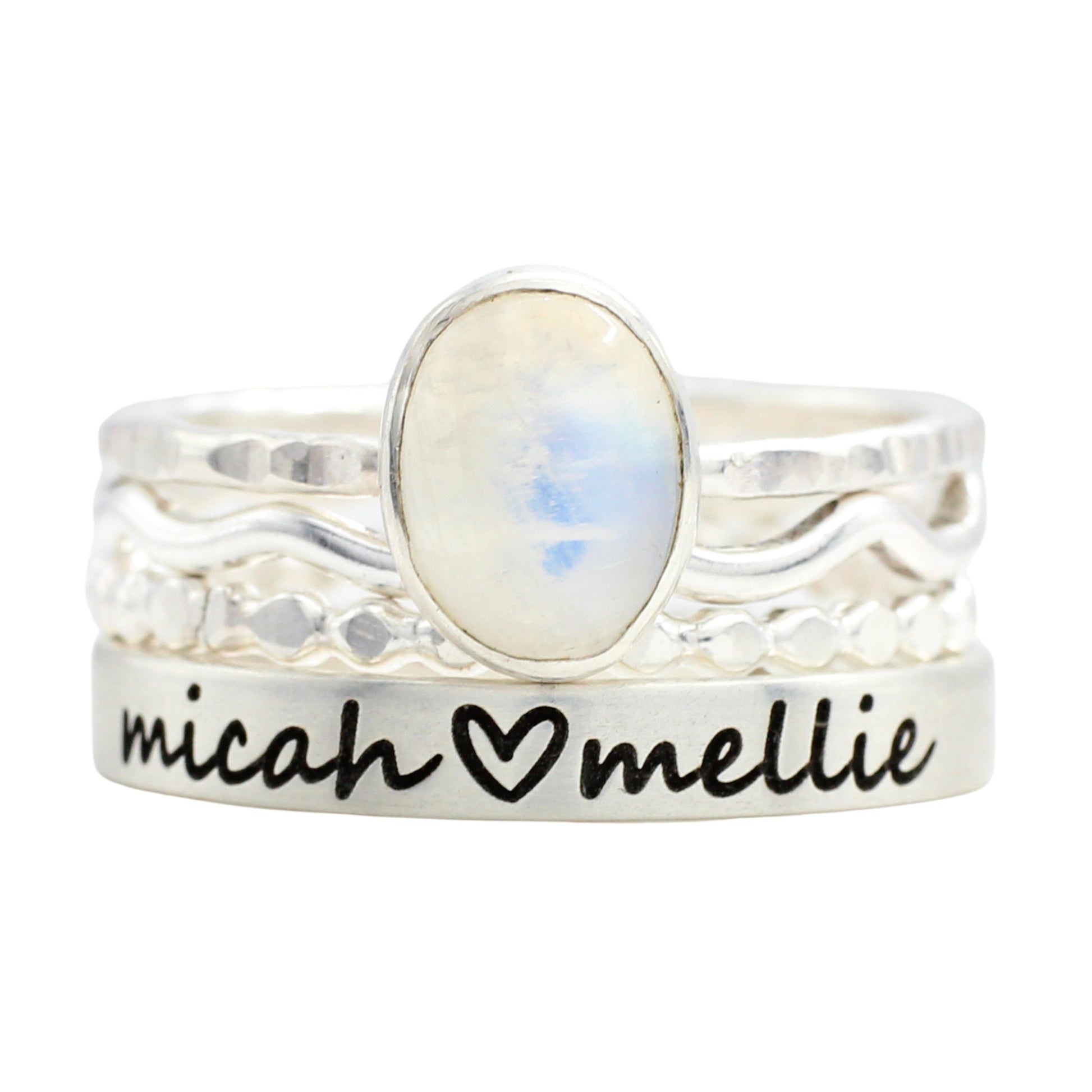 The set includes one 8x6mm moonstone ring on a faceted band, one 3mm engraved band, one dot band, and one wavy band.